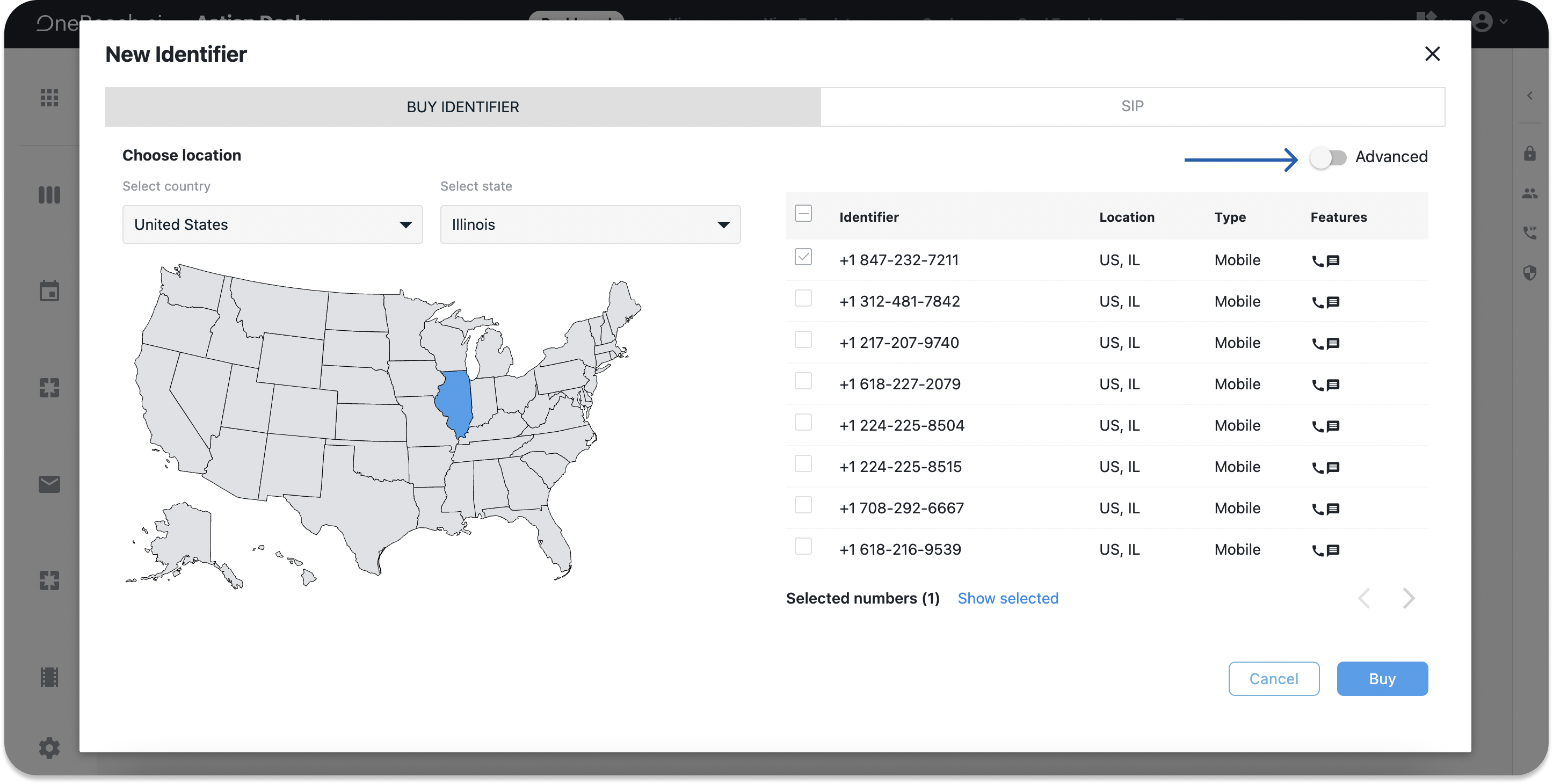 - Select the country (and its state) and the identifier you would like to buy.