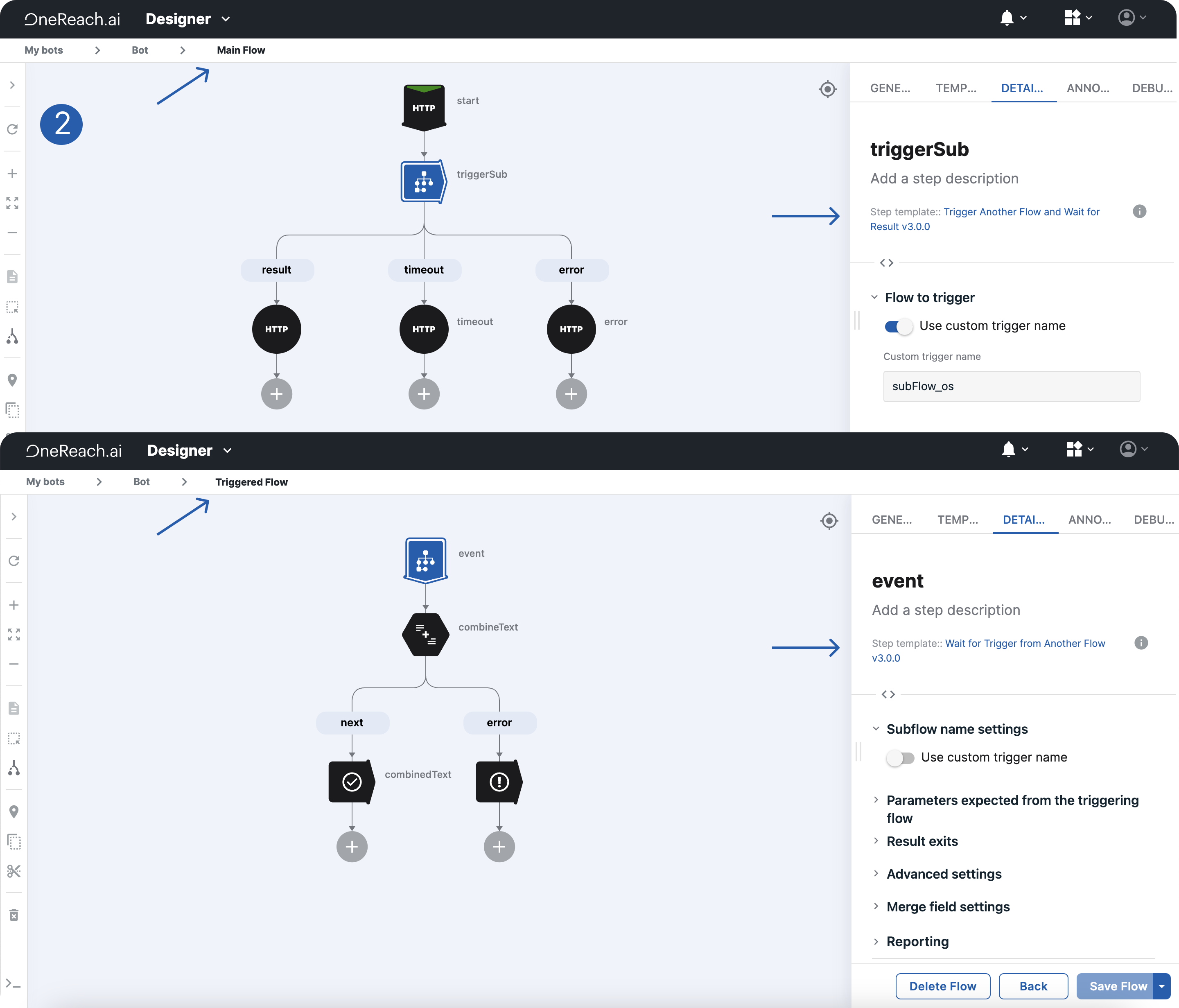 Triggered Flows are separate Flows, they have a cold start, meaning they need more time to start their execution. They are created with the help of the Trigger Step templates in both the main Flow and the Triggered Flow itself (2).