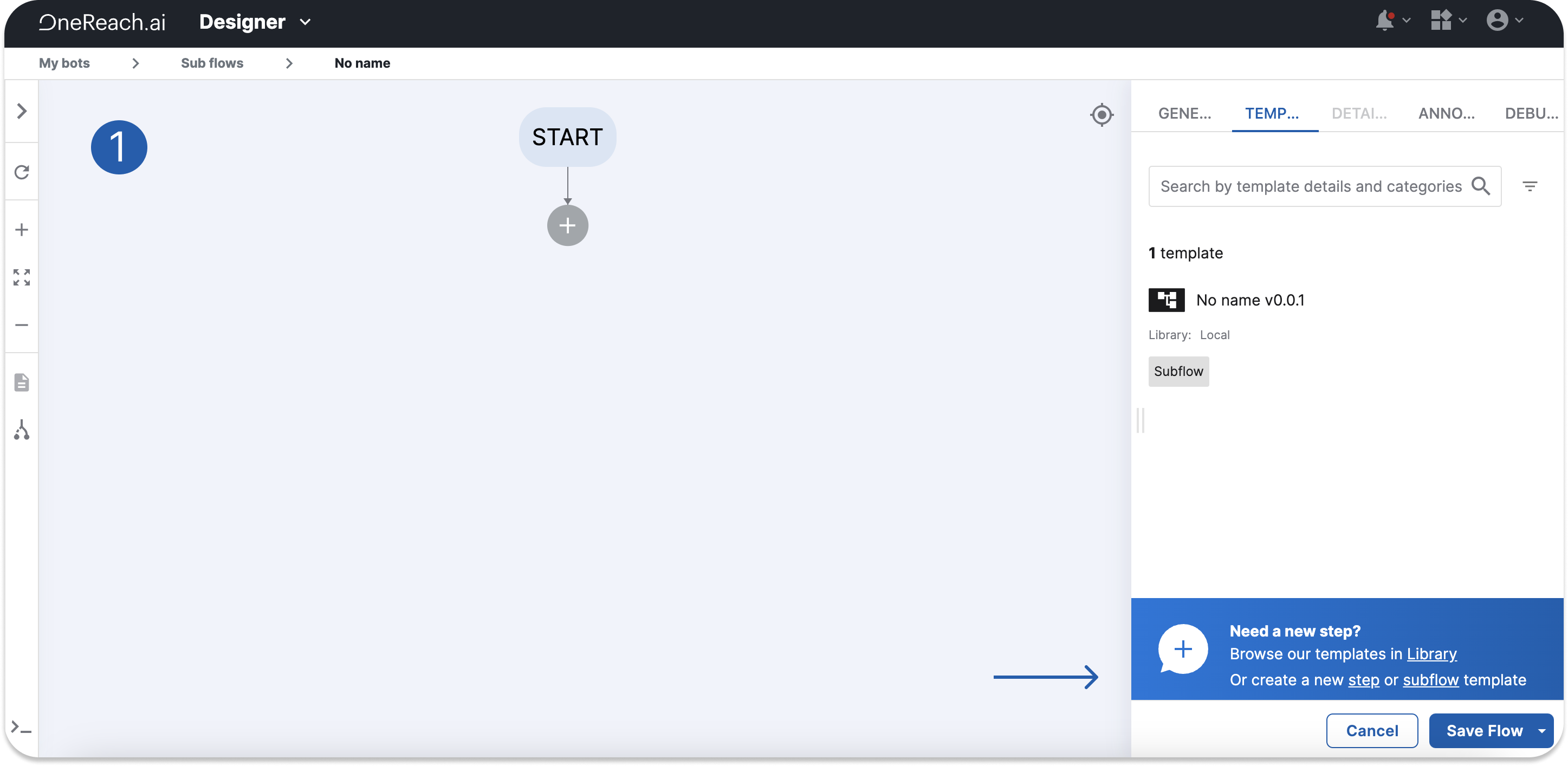 - Drag and drop the Subflow template from the Templates tab onto the Canvas.
