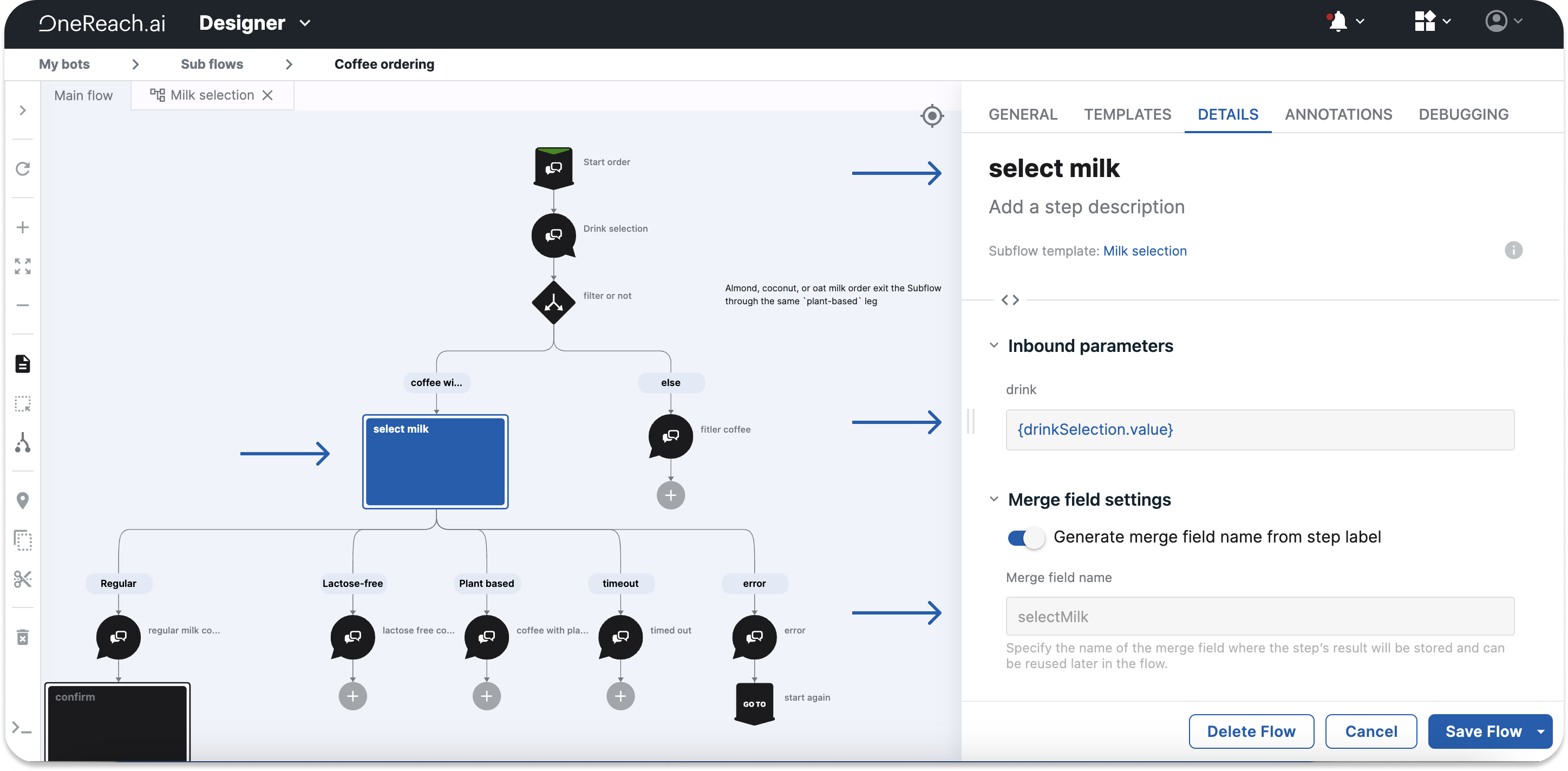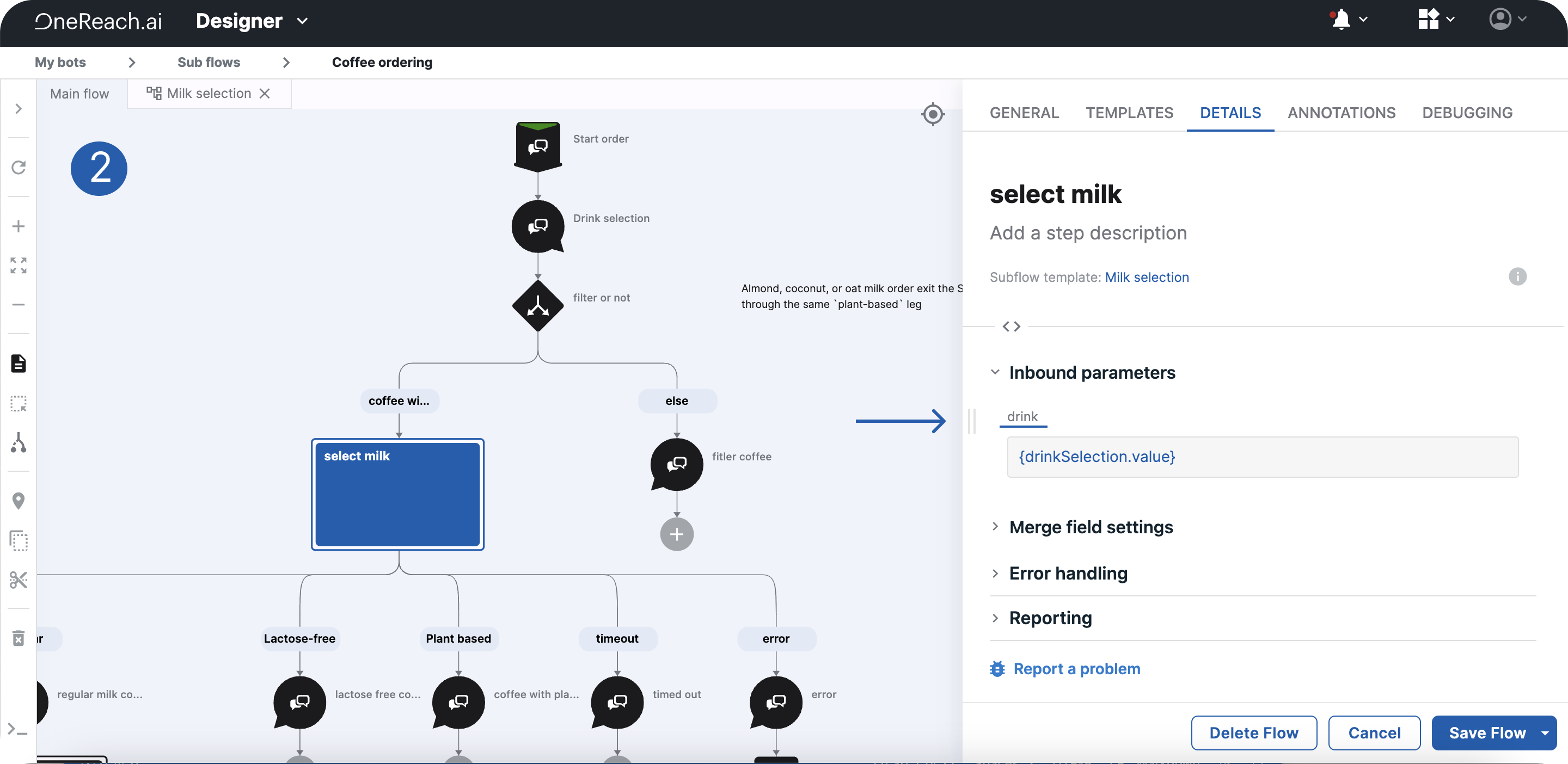 Note how the name of the inbound parameter from image (1) is displayed in the main Flow on image (2).