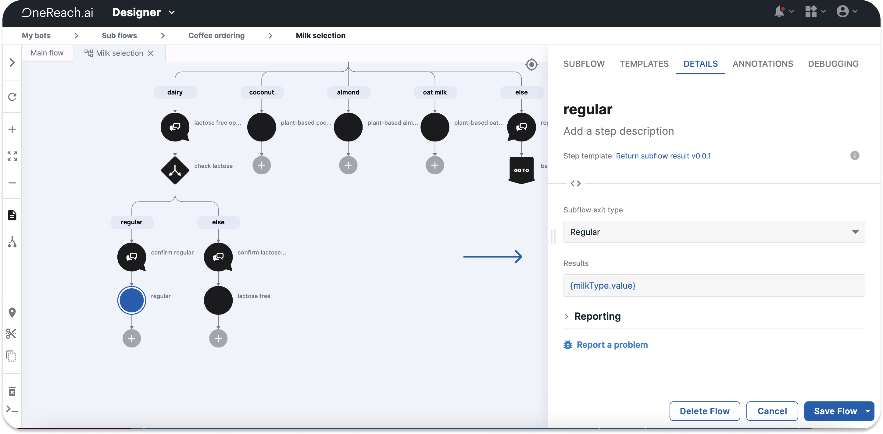 You can use the same exit in the Return subflow result Step template multiple times. Your Subflow logic can have many branches and options exiting dozens of legs. But as a global result of the Subflow execution, you can map those legs to fewer exits when working on the main Flow level.
