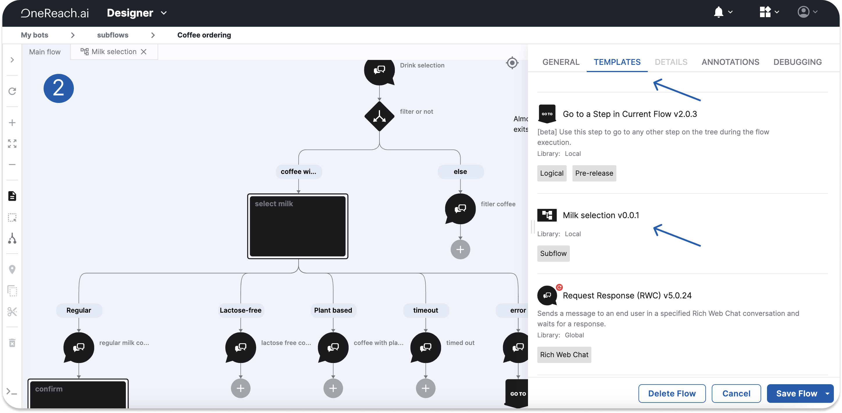 To create an empty Sublfow template as part of the main Flow, click subflow in the Templates tab (1). The empty template will open in a separate tab next to the main Flow tab. The Subflows you create will automatically appear as templates in the list of Step templates in the Templates tab (2). To add them to the main Flow tree or reuse them, drag and drop them onto the Canvas.