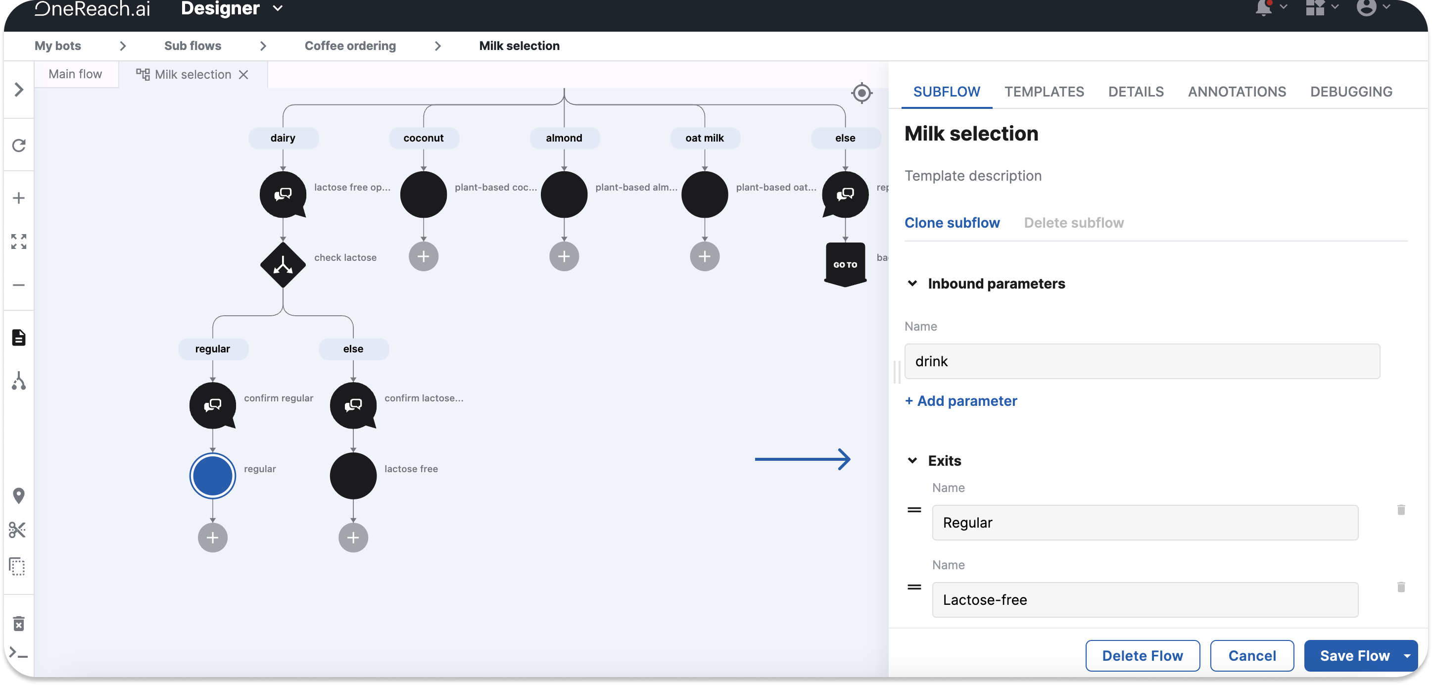 - Exits: define through which exits the Subflow will exit in the main Flow.