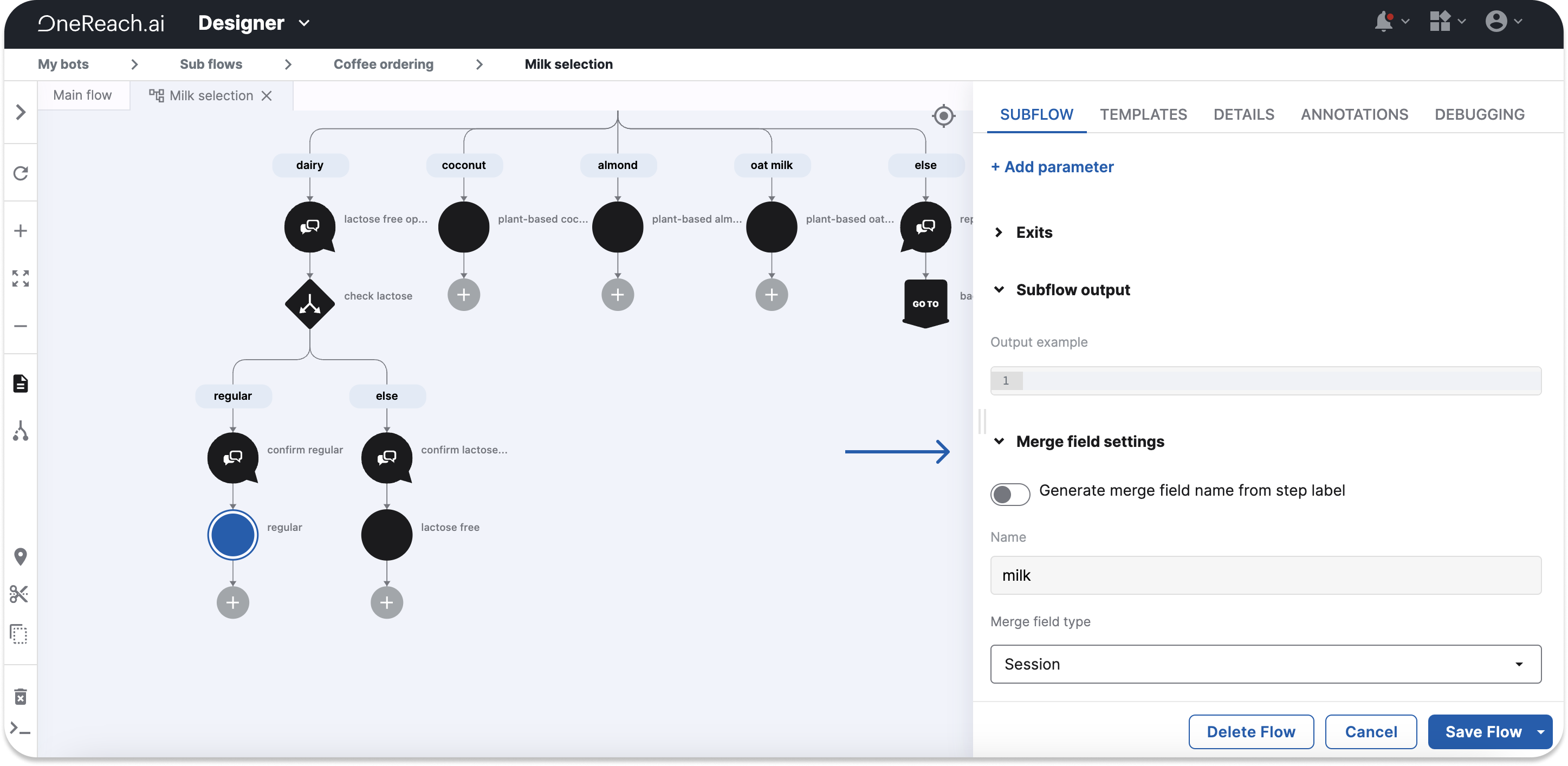 - Session and Thread Merge fields created in a Subflow are visible within the current Subflow only.